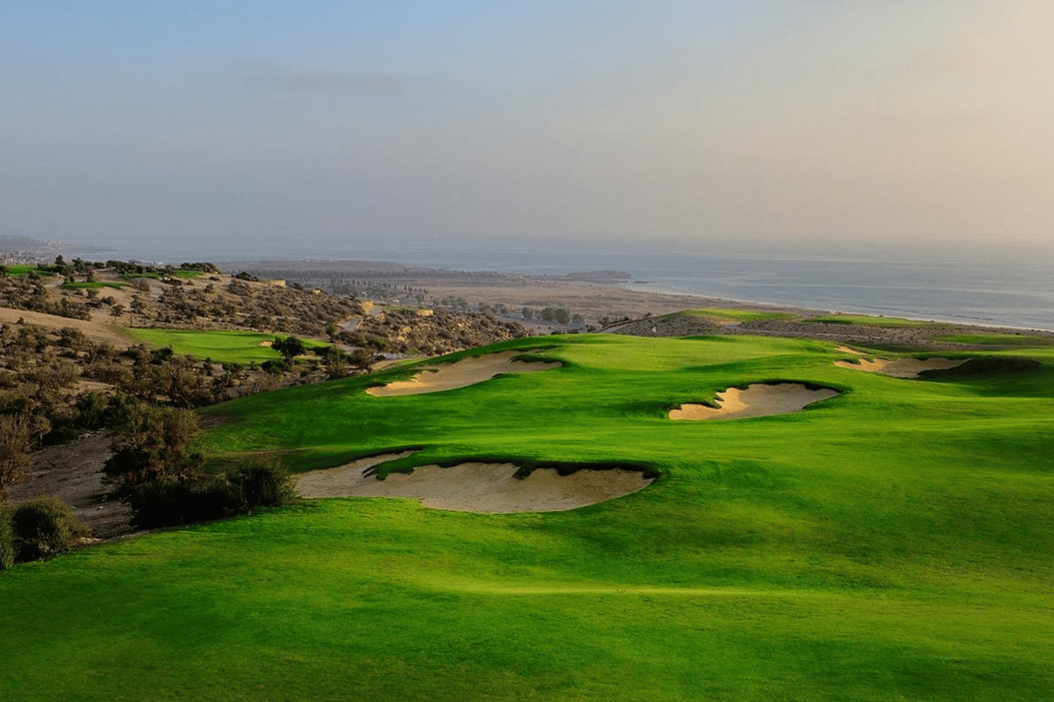 Vous êtes à moins de 20 km au nord d'Agadir.Construit sur un terrain de 30 hectares et dominant l'océan Atlantique de près de 80 mètres, le parcours est de toute beauté.Les points de vue sont saisissants. Grace aux multiples aires de départ, tout un chacun trouvera son plaisir.Ce qu'en dit Kyle Phillips « Ce que les visiteurs vont apprécier à Taghazout Bay est le rythme du parcours. Les premiers trousdémarrent en s’éloignant de l’Océan sans jamais le perdre de vue et le spectacle devient saisissant au fur à mesure du tracé. Il existe une variété de trous longs et courts mais un de ceux qui restent gravés dans mon esprit est le trou 9 qui revient vers le clubhouse […]. Les trous 17 et 18 sont du point de vue stratégique et ludique probablement parmi les trous les plus stimulants que vous allez jouer n’importe où au monde »